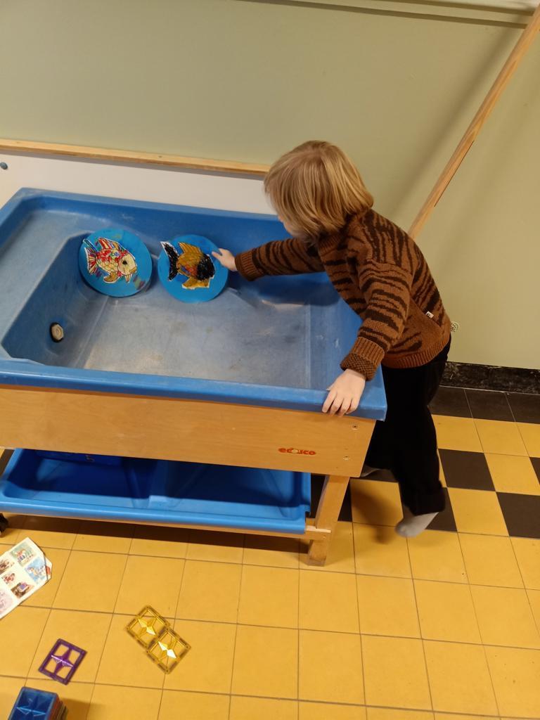 Tijdens de thematijd wordt er al volop gebouwd, geknutseld en getekend. De zandbak is door de kleuters omgetoverd tot aquarium met zelf geschilderde vissen. De betrokkenheid is enorm en de eerste verhalen worden al gedeeld. Zo weten we inmiddels dat een hond echt geen chocola mag en dat je een vis beter niet kunt aaien... 🐟